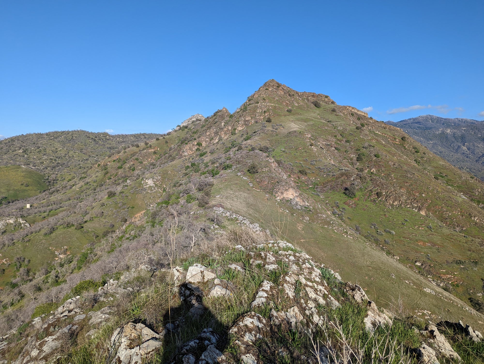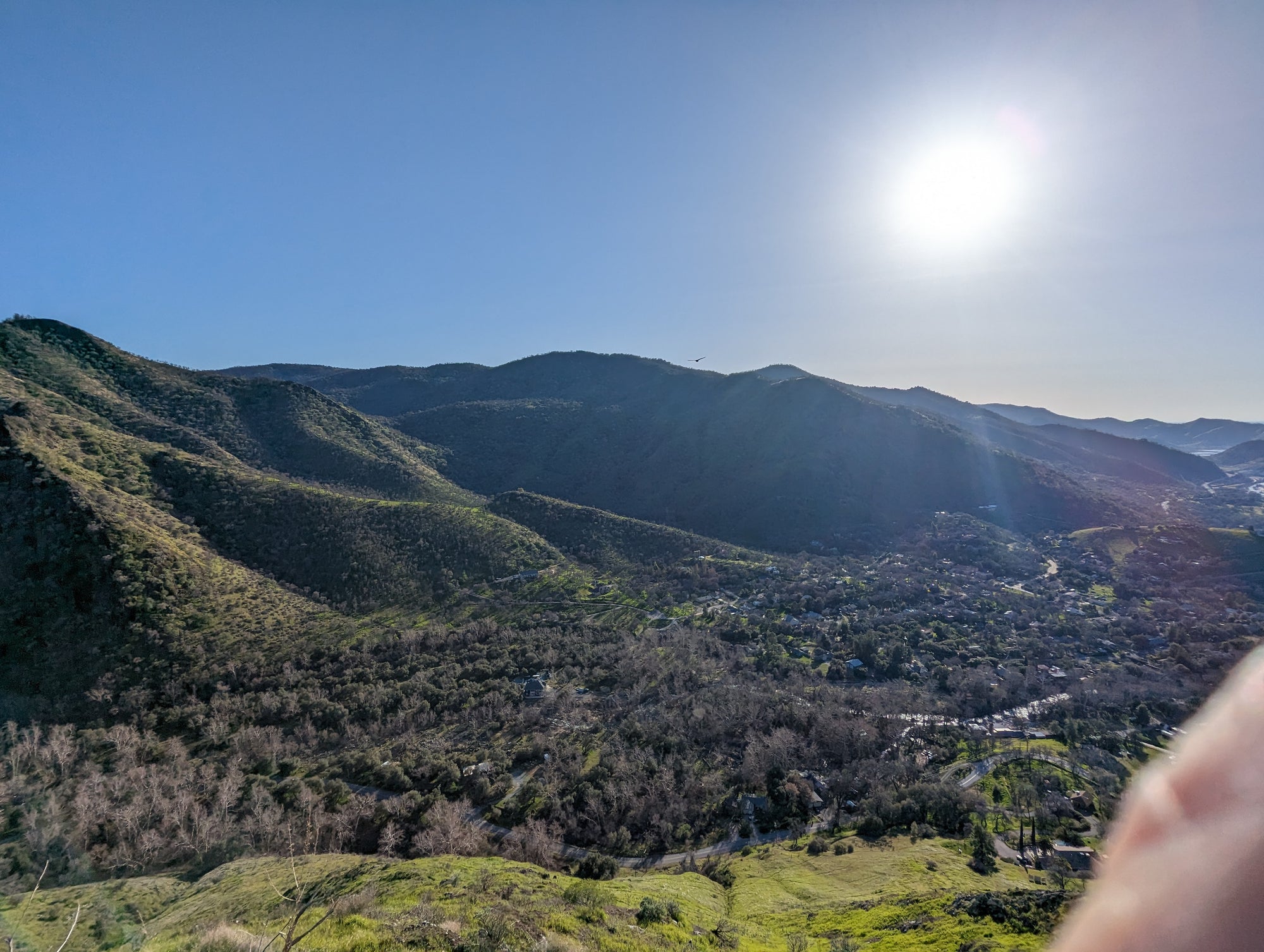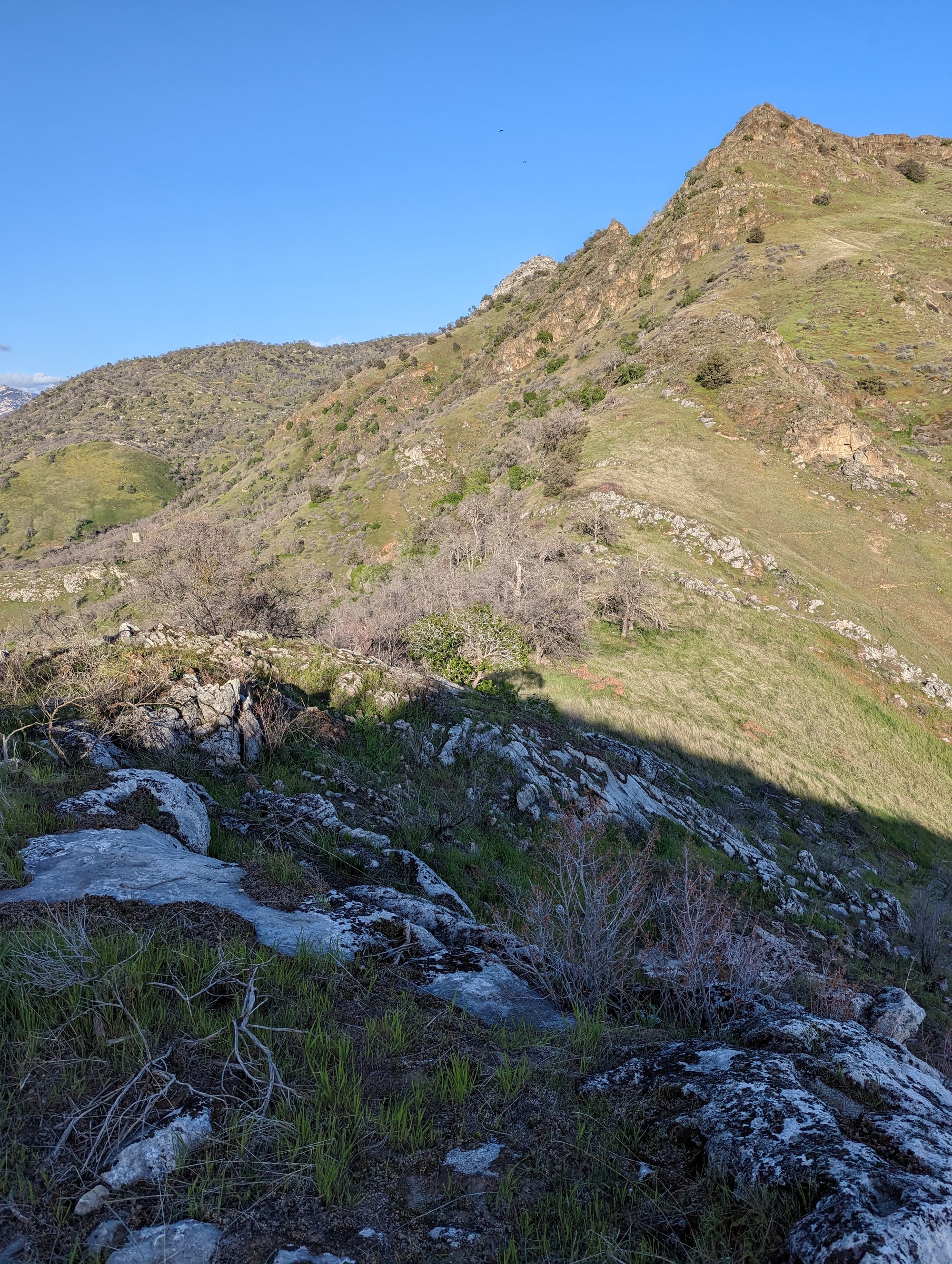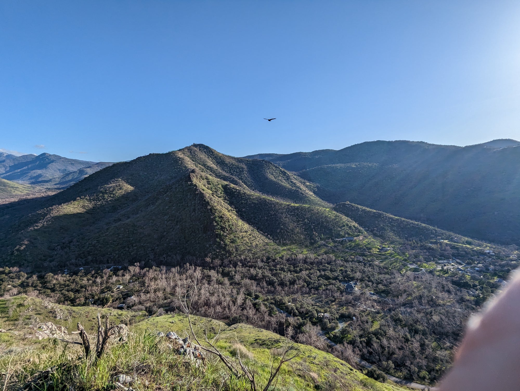 The view from Little Blossom is just fantastic. You can look straight onto Blossom Peak, down into the South Fork, out to Lake Keawah and onto main street Three Rivers. It's a steep drop down from Little Blossom into the South Fork, so my mind wouldn't let me too close to that edge. It looks to me like Little Blossom is at about 1,700 feet in altitude, which puts it about 900 feet above the valley. So when you are up there, you can look down at birds that are soaring above the ground. The bird in some of the photos is a vulture.