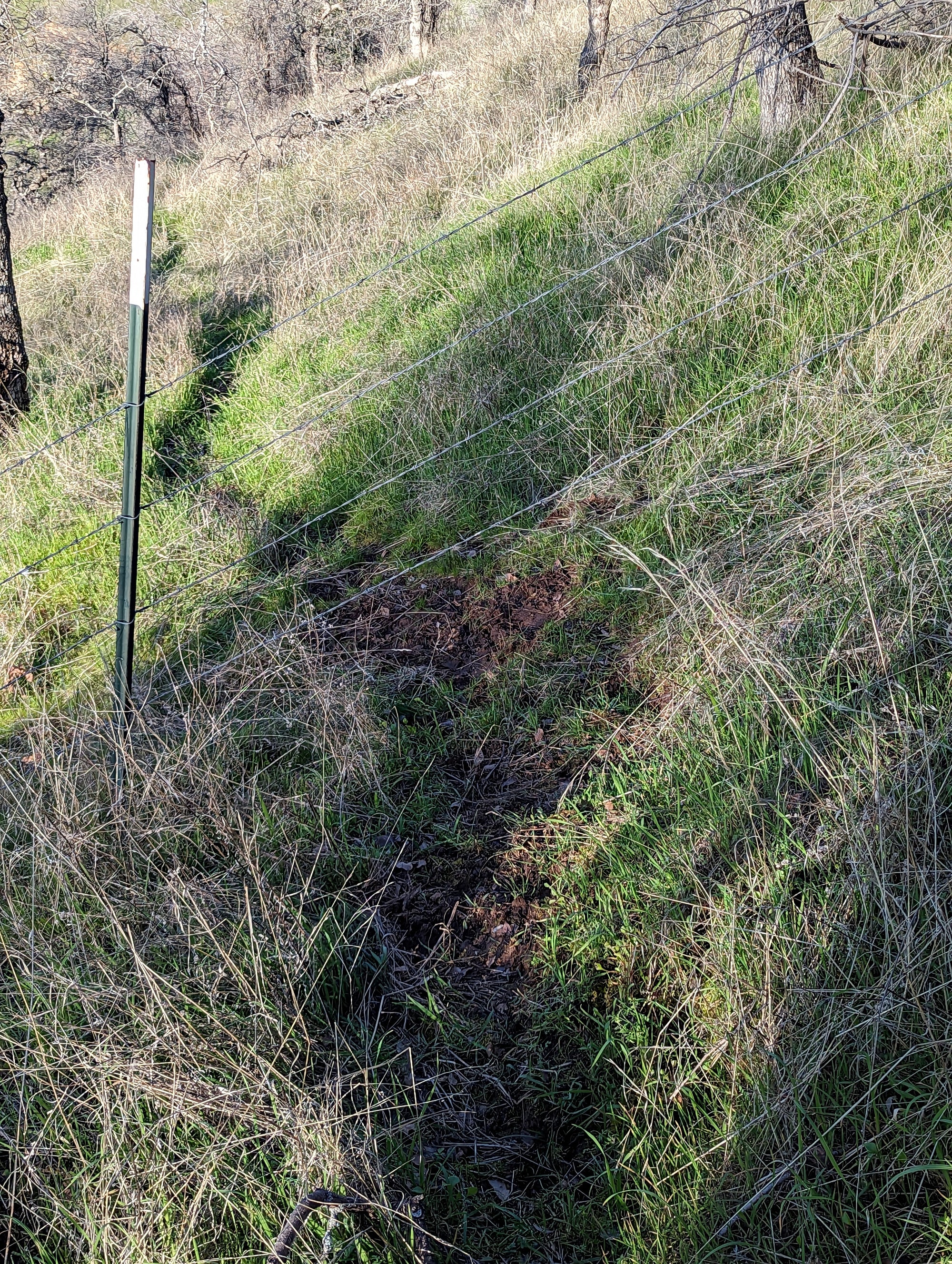 Today, I took my first hike to the top of Little Blossom which is the peak on the property that leads up to Blossom Peak. The hill is steep from the cabin up to the top, so I took hiking poles with me which helped quite a bit. I followed the zigzagging paths carved out by the deer. Above the cabin is an area fenced in for cattle, which doesn't have any gates at the top. So I found an area that the deer use to cross the fence. You can see it the last photo in the gallery below. I crawled under the fence, which I thinks means I'm smaller than a cow.